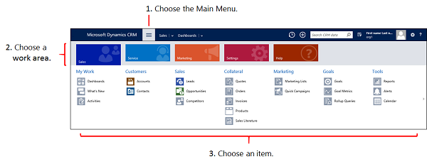 With the new menu features, you can get where you need to go faster, less scrolling and fewer clicks. Upon clicking on a work area tile (like Sales), you get a list of all the entities/items per section in the work area.